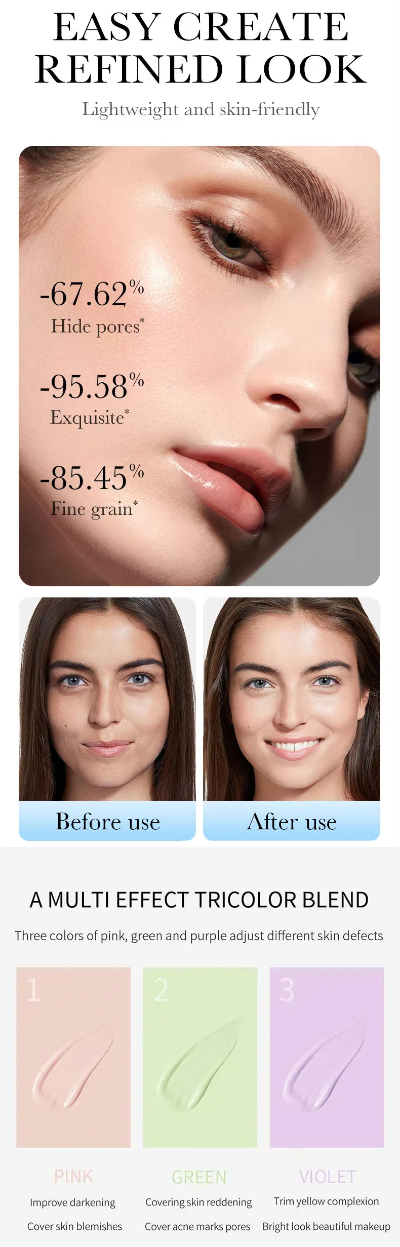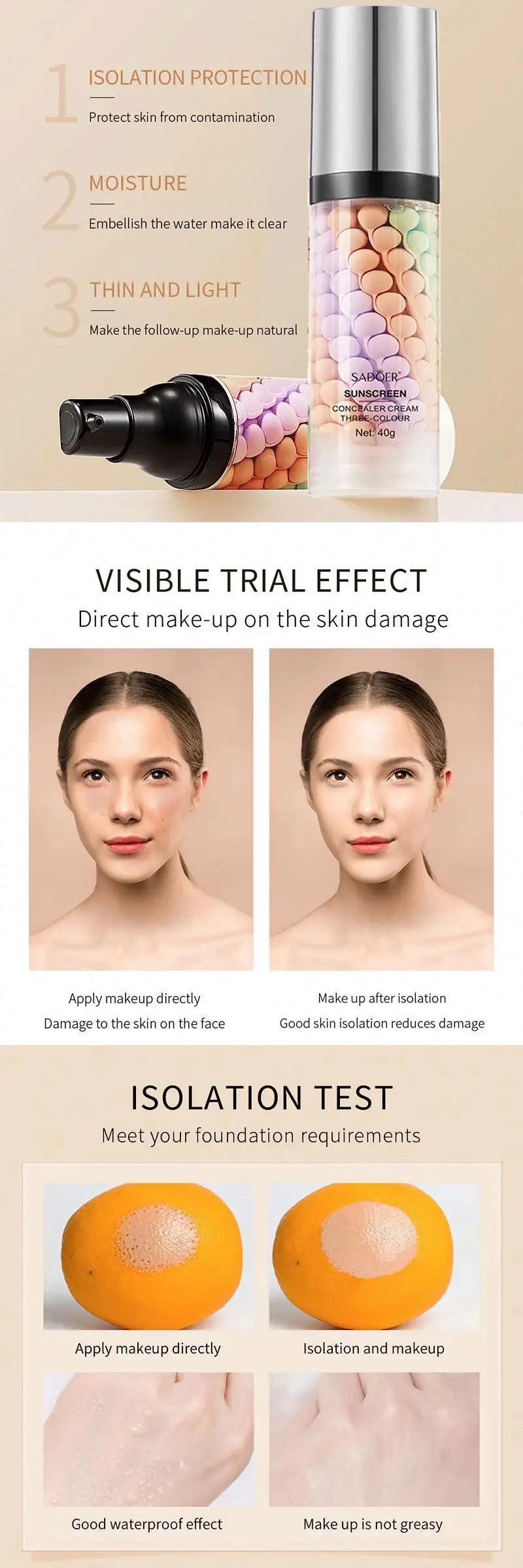 ✨ Multitasking Effect: The tricolor formula of Sadoer cream conceals imperfections, and the CC Cream unifies skin tone, giving it a healthy glow.